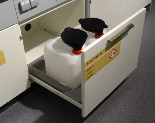 Meuble bas pour la récupération d’acides et de bases (W027)Meuble bas de laboratoire pour stockage et récupération de déchets acides et basiques avec bac de rétention et raccordement à extraction